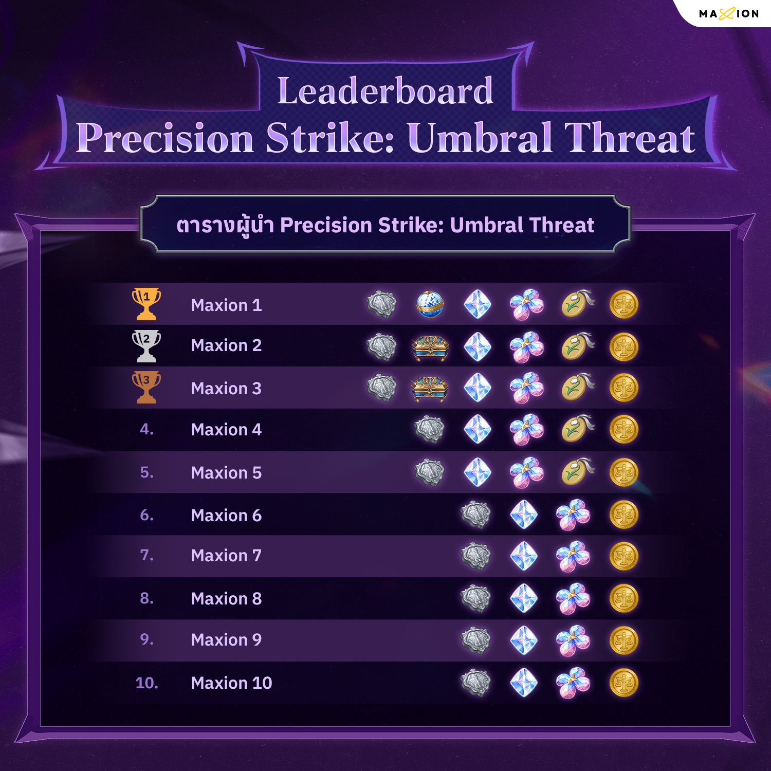 - รางวัลจะถูกจัดส่งให้ผู้เล่นตามอันดับสุดท้าย หลังจบกิจกรรม